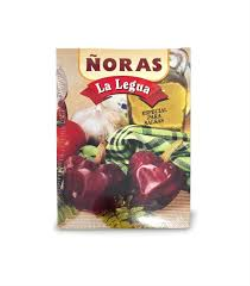 ÑORAS SECAS LA LEGUA 60g ORIGEN ESPAÑA La ñora es un tipo de pimiento seco muy utilizado en la cocina española, especialmente en la región de Valencia, cuna de la paella. Procede del pimiento choricero, aunque tiene algunas diferencias en cuanto a sabor y textura. La Ñora no es picante y tiene su pulpa especialmente carnosa. Son antioxidantes gracias a la vitamina E y además Ayudan a combatir la artritis. También favorecen el crecimiento del cabello. Además tienen ácido fólico, carotenos y betacarotenos y refuerzan al sistema inmunológico ayudando a la creación de glóbulos rojos y blancos.